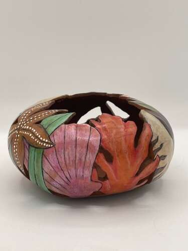 Gourds come in all shapes and sizes and can be carved, wood burned, woven with a multitude of fibers, painted and dyed. I often feel that each gourd that I design has a way of letting me know what they "want to be" and the evolution process that can sometimes be a "head scratcher" always delights me when a piece is completed.
