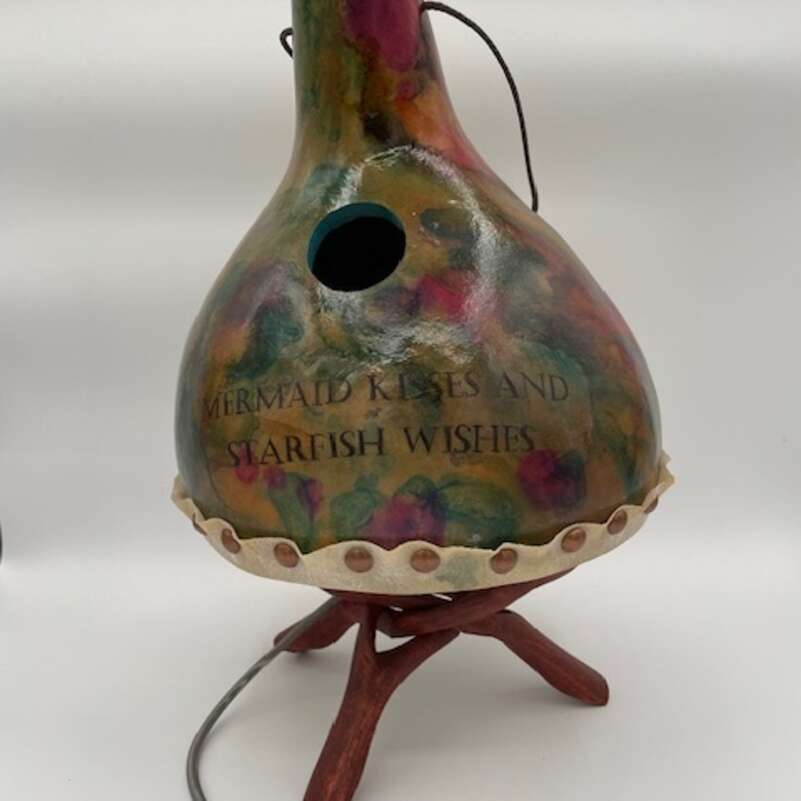 Large Martin gourd with original mermaid design wood burned and colored with ink dyes.